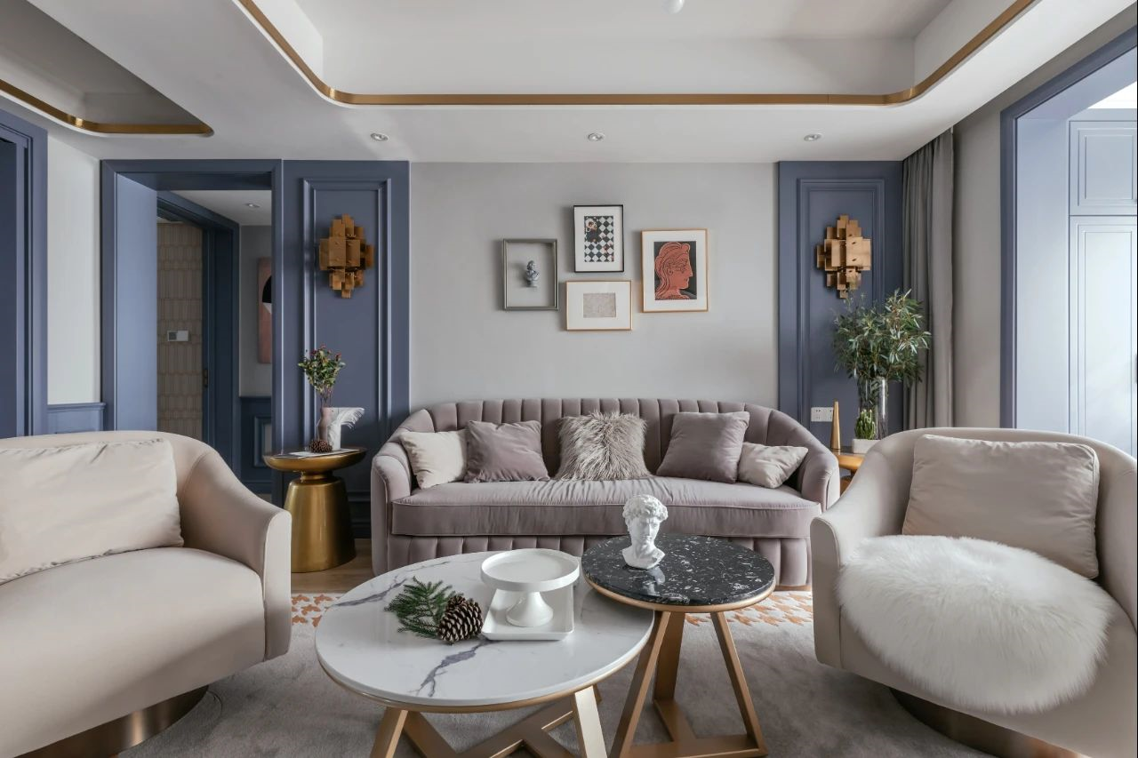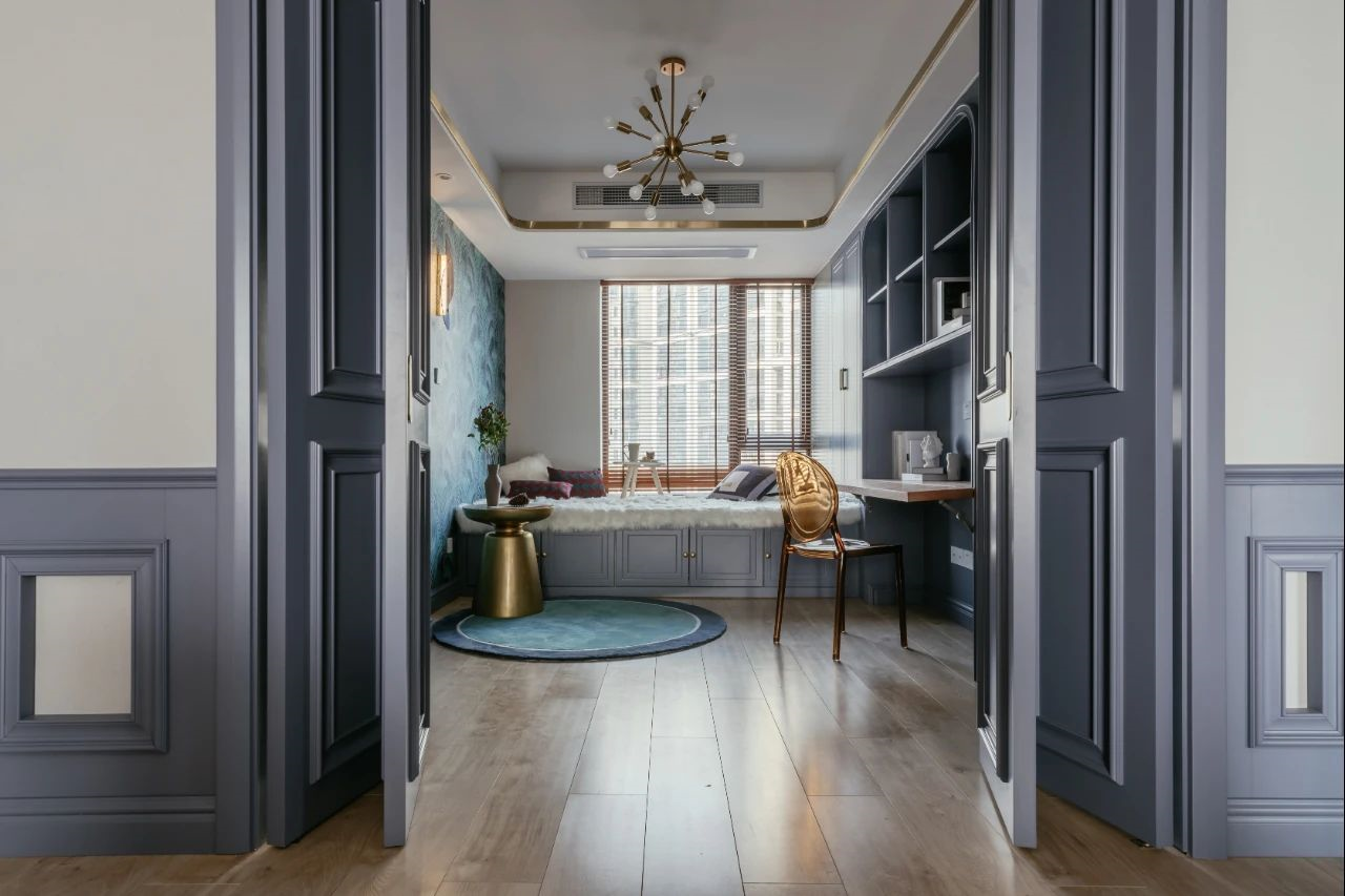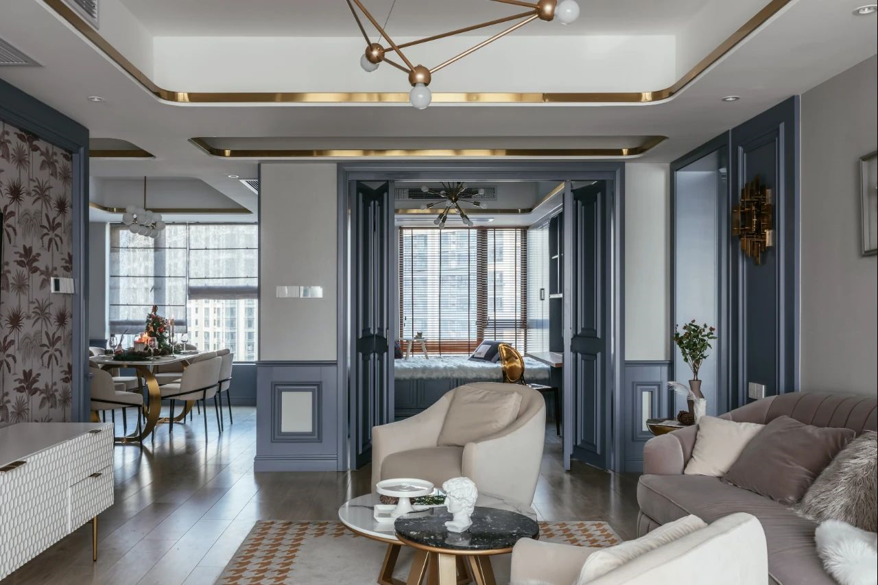 132㎡美式輕奢,墻面藍(lán)色造型,吊頂金屬線框,營造出溫情華麗