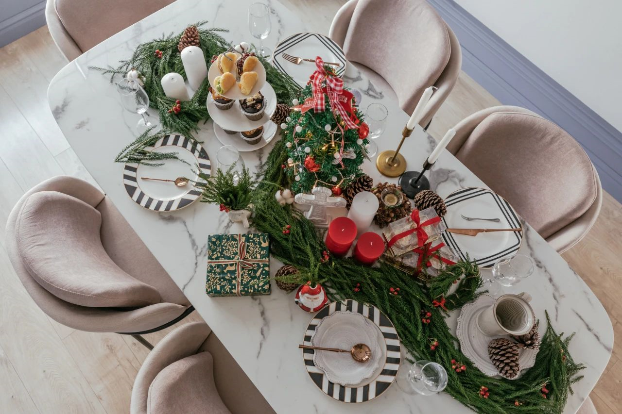 ▲餐桌上布置端莊雅致的餐具,餐廳角落也有綠植點綴,讓空間顯得華麗而又清新舒適。