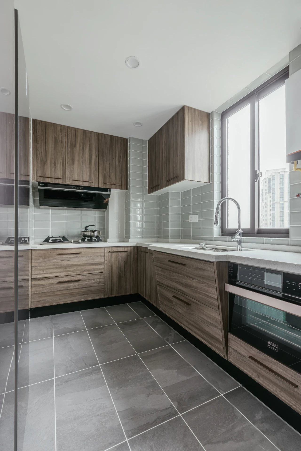 ▲廚房在啞光灰色地磚的空間基礎(chǔ),墻面是灰色的面包磚,搭配木色的定制櫥柜,操作臺的水槽位置加寬加大,保持寬敞廚房通道的同時,也讓空間更加靈活實用。