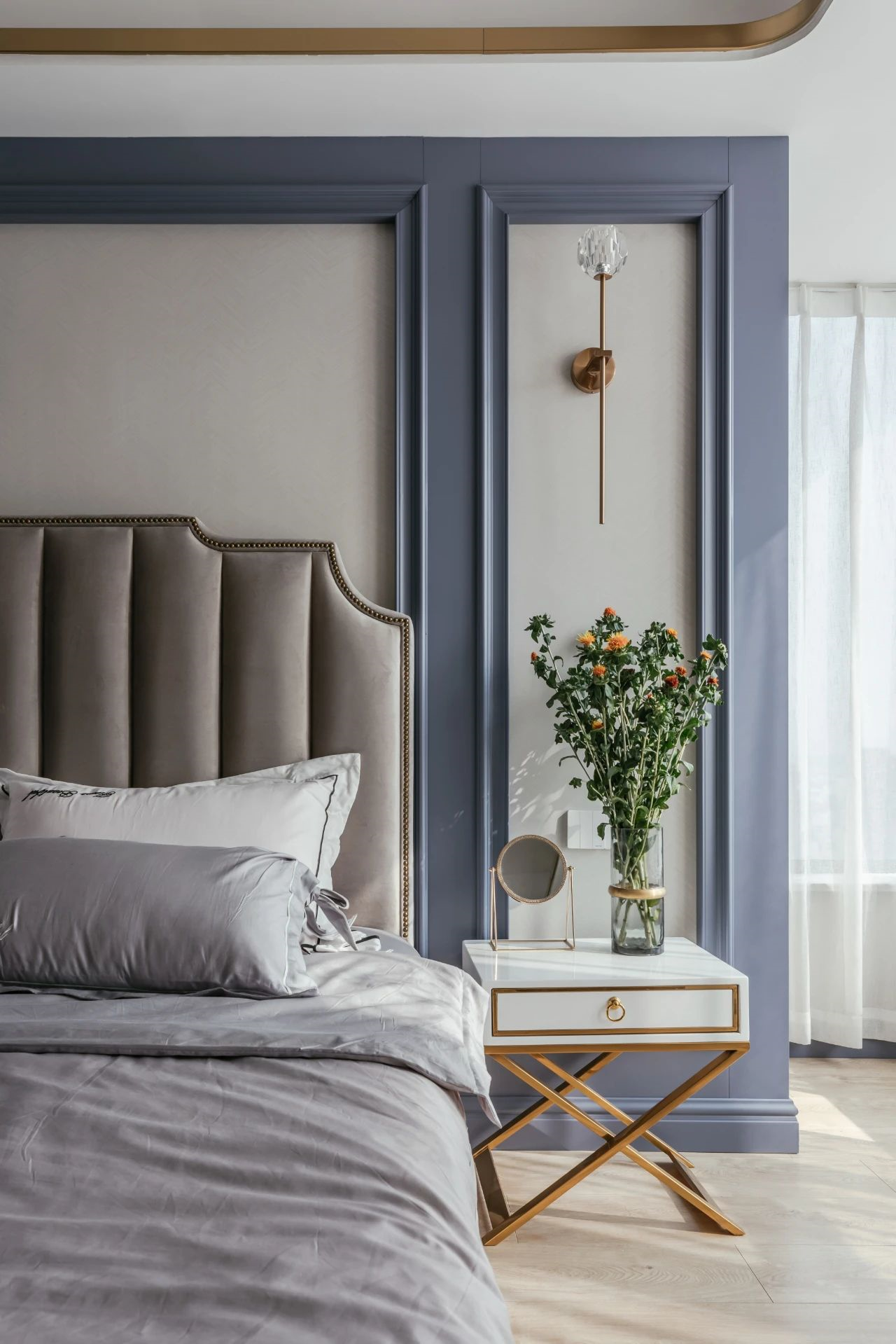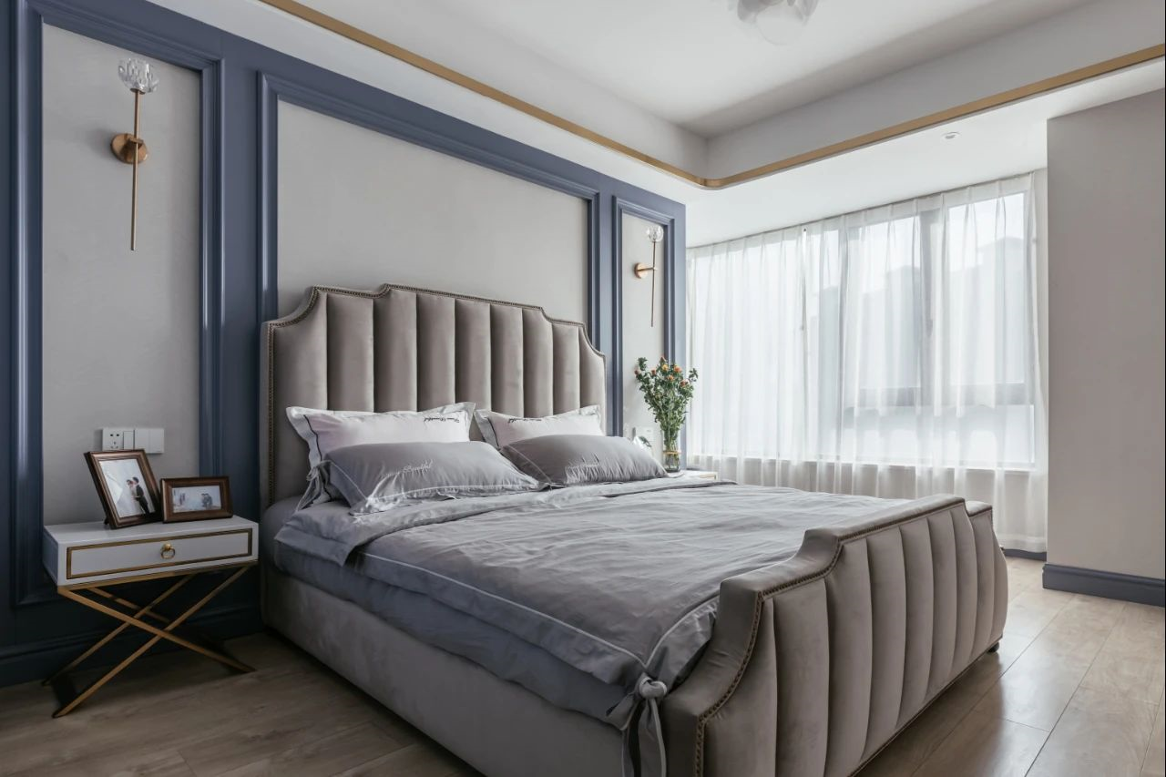 ▲臥室床頭墻加入藍(lán)色的邊框造型,布置上舒適的灰色布藝床鋪,金屬交叉腳的床頭柜與金屬壁燈,與天花的金屬邊框相呼應(yīng),帶來的是一種華麗而又安靜優(yōu)雅的臥室氛圍。
