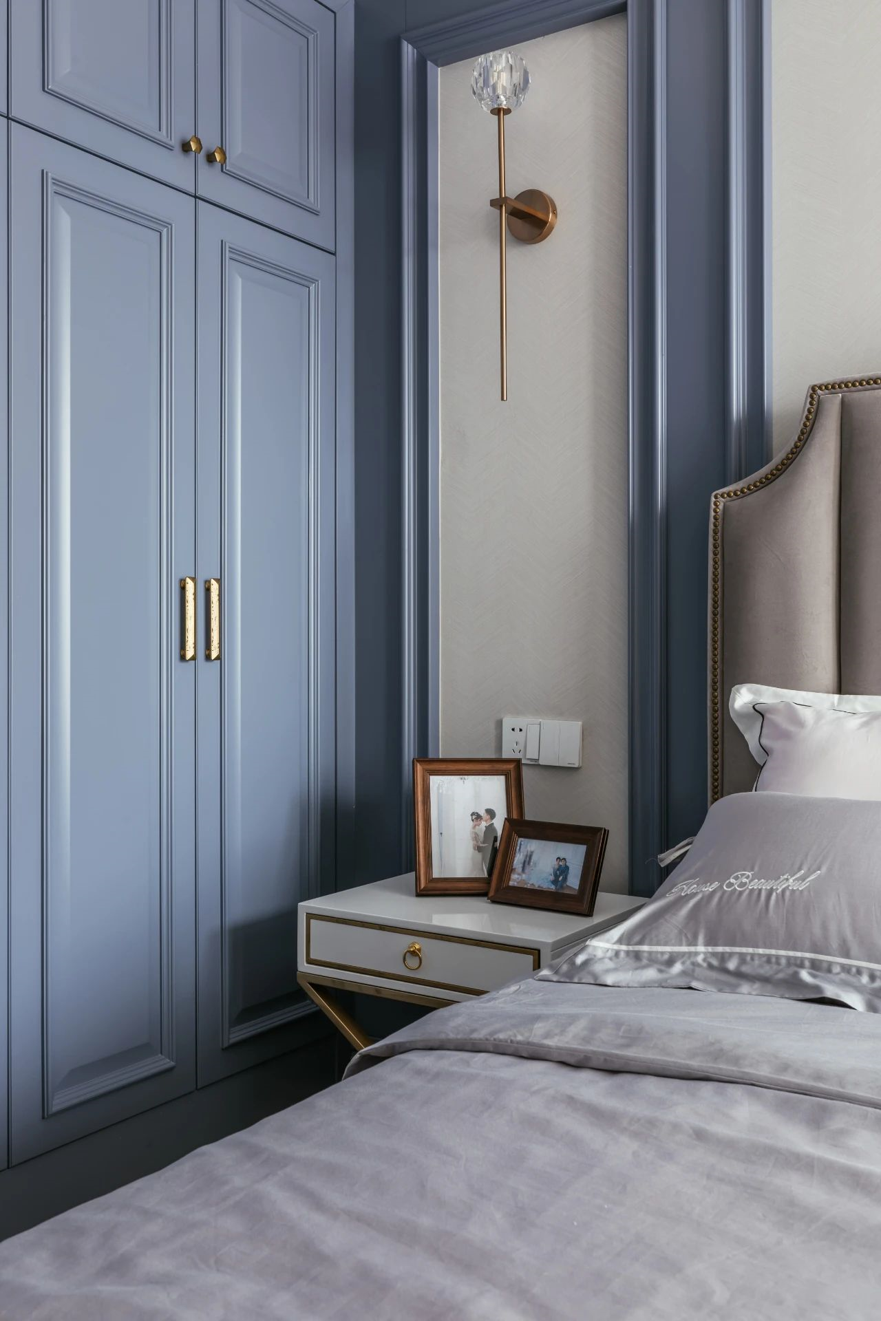 ▲藍(lán)色柜門的衣柜,加入金屬拉手,床頭柜上擺著主人的小婚紗照,呈現(xiàn)出一種實用而浪漫的臥室睡眠氣息。