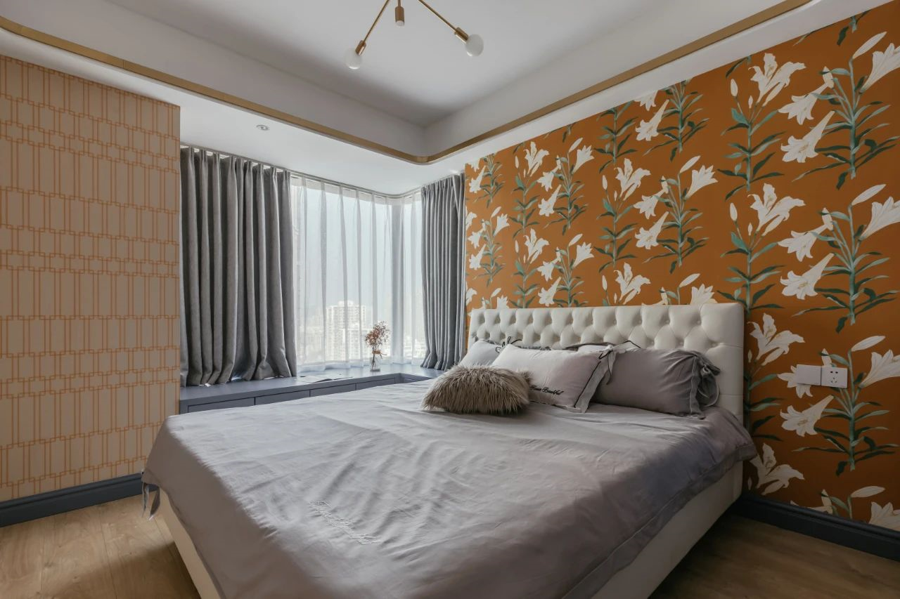 ▲父母房以自然的泥土色+植物圖案的床頭墻墻布,布置米白色布藝床,整體空間暖色調(diào)的氛圍,顯得素雅而又舒心愜意。