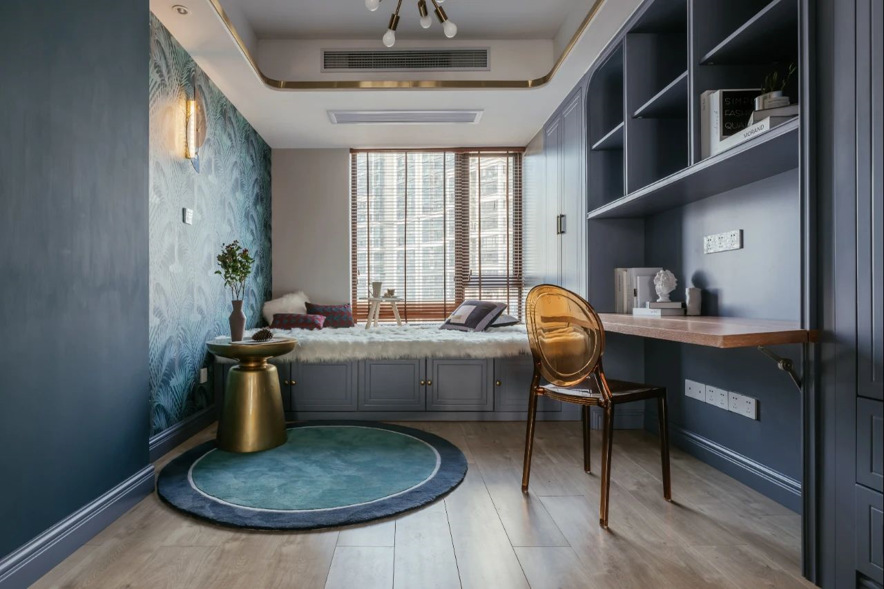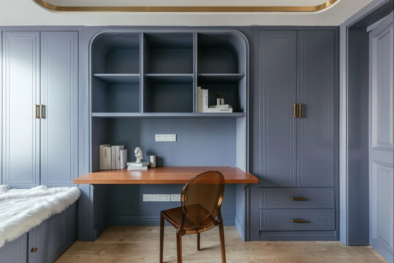 ▲書房左側(cè)是深藍(lán)色的墻面漆+墻布組合設(shè)計,另一側(cè)則是書桌+衣柜的組合定制,整體空間顯得充滿安靜優(yōu)雅的舒適氣息。