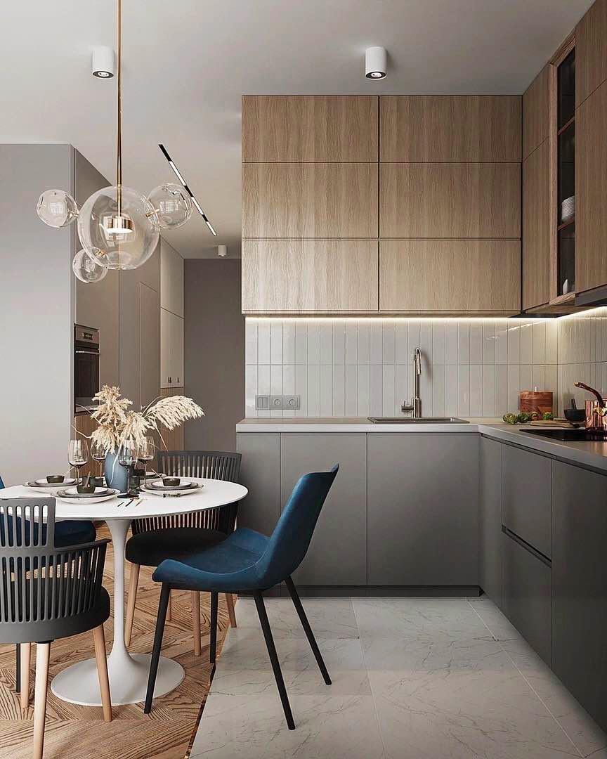 把收納做成隱藏式,柜門(mén)外面可以做無(wú)拉手設(shè)計(jì),即使你家廚房只有幾平米,這樣空間也會(huì)看起來(lái)更寬闊整潔,不雜不亂。