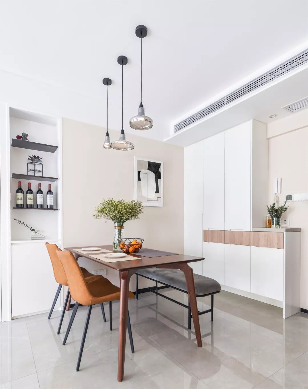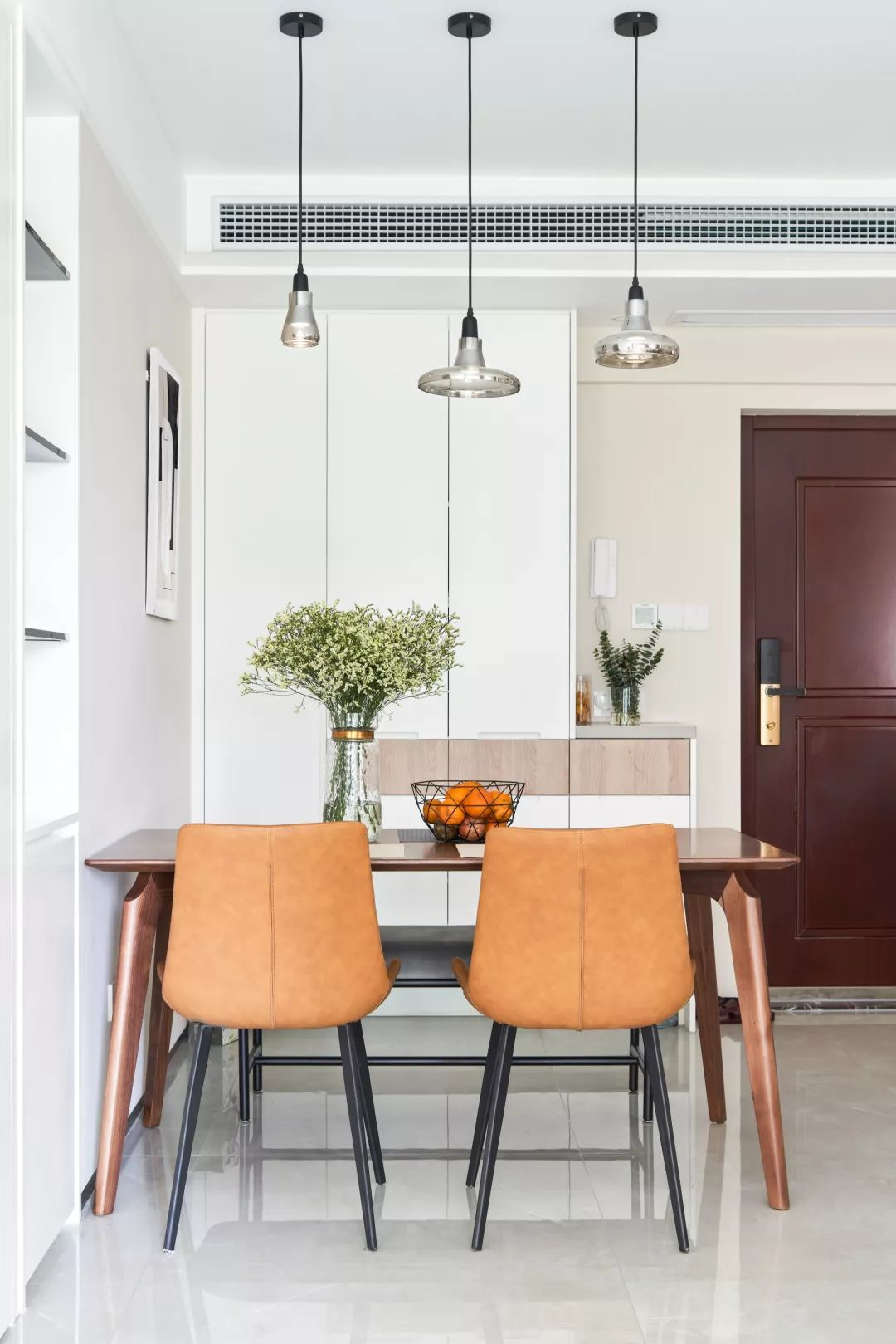 ▲入戶沒有玄關(guān)走廊的戶型,直接在入戶門側(cè)方的墻面做柜子,把餐邊柜和鞋柜給結(jié)合起來,兩者合一也能節(jié)約一些空間。