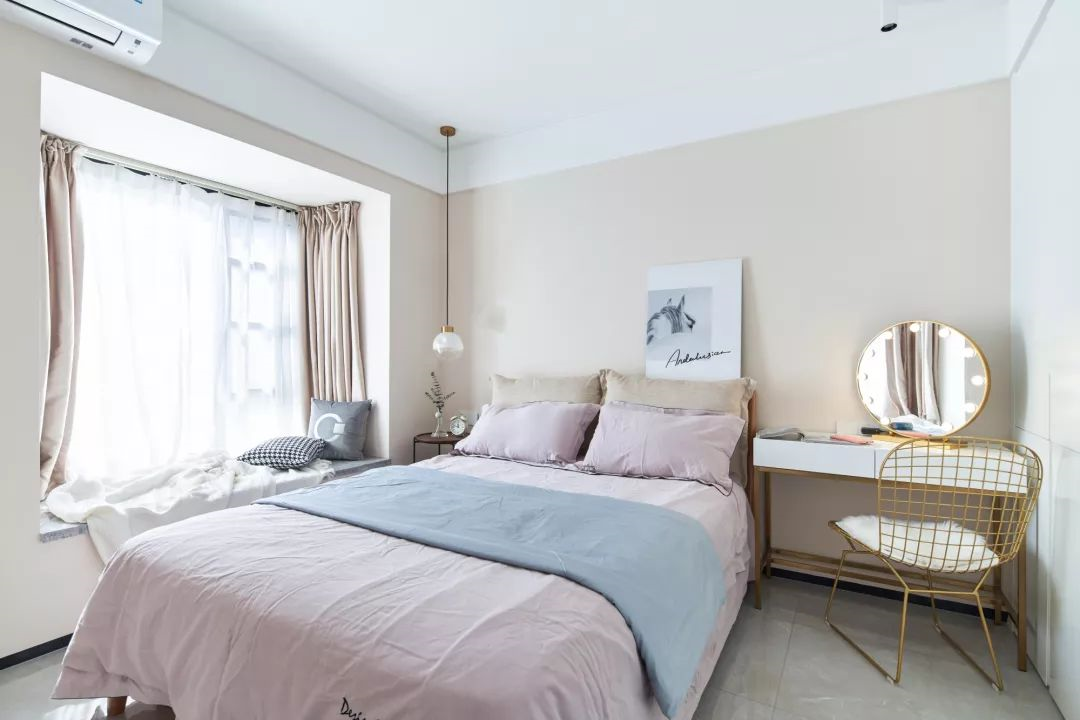 ▲主臥室的墻面同樣是選擇了藕粉色,搭配粉色的床品和部分的藍(lán)色作為點(diǎn)綴,整個(gè)空間看起來優(yōu)雅浪漫而又清新舒適。