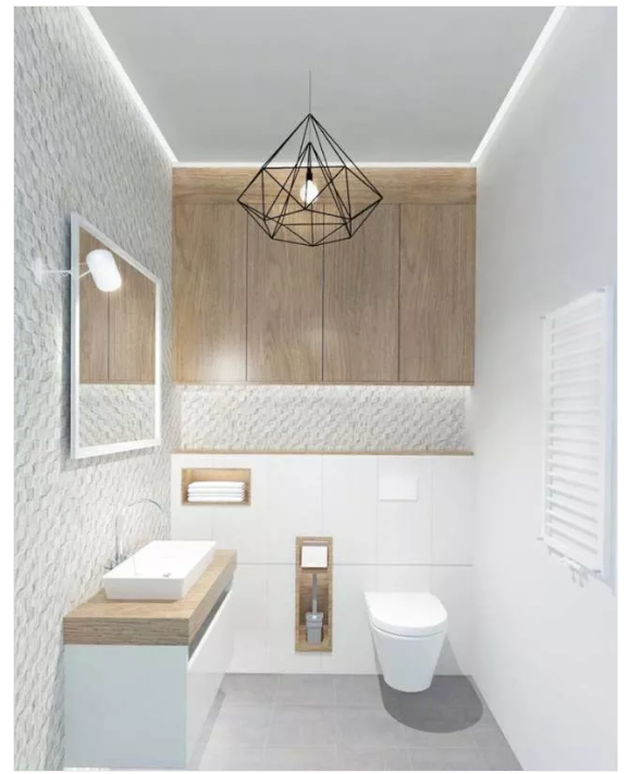 除此之外還可以將衛(wèi)浴鏡與嵌入式收納結(jié)合起來,保證美感的同時,還可以在墻體上方放置物品。